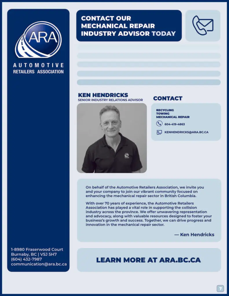 The ARA Mechanical Repair Division is here to support B.C.’s independent and franchise repair shops by advocating for fair business practices, access to OEM repair information, and skilled workforce development. We tackle regulatory issues, training gaps, and industry challenges to ensure repair professionals have the resources and support needed to succeed in a changing automotive landscape.